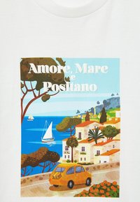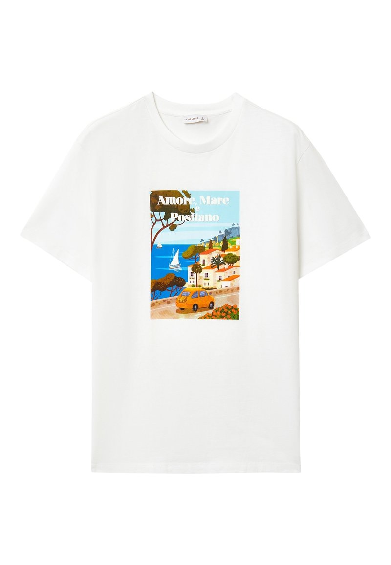 T-shirt blanc à manches courtes avec un imprimé coloré de paysage côtier comprenant une voiture jaune, des voiliers, des arbres et des maisons avec le texte "Amore, Mare e Positano".