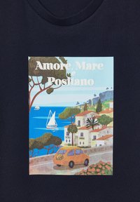 T-shirt marine avec un graphisme d'une ville côtière, une voiture orange sur la route, un voilier sur une mer bleue, des arbres, et le texte "Amore, Mare Positano".