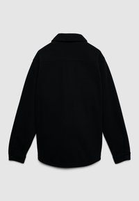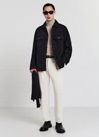Veste-chemise en mélange de laine noire avec deux poches poitrine et fermeture à boutons. Portée par-dessus un col roulé beige. Mannequin portant des lunettes de soleil foncées.