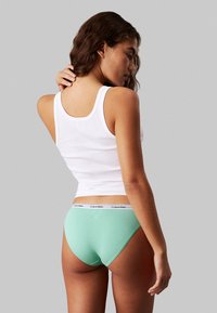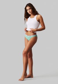 Débardeur blanc côtelé associé à un slip de bikini vert menthe avec une ceinture à logo Calvin Klein. Tissu lisse, coupe ajustée.