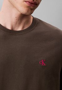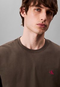 Jeune homme aux cheveux bruns portant un t-shirt à manches courtes vert olive avec un logo rouge "cK" et un jean bleu, les mains dans les poches, sur un fond gris uni.
