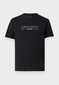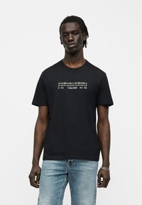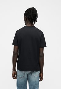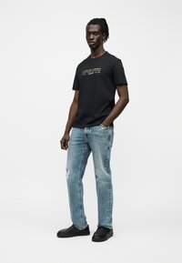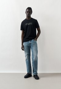 Jeune homme à la peau foncée et aux dreadlocks, portant un t-shirt noir Calvin Klein et un jean bleu clair, debout devant un fond blanc uni.