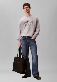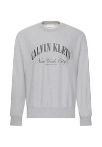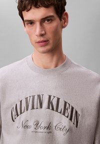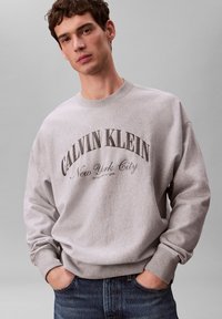 Jeune homme portant un sweat-shirt gris clair Calvin Klein avec le texte "New York City", un jean bleu et une ceinture noire sur un fond gris.