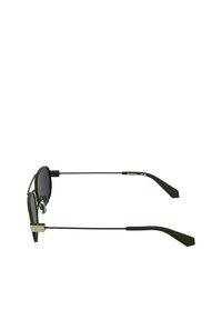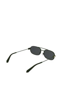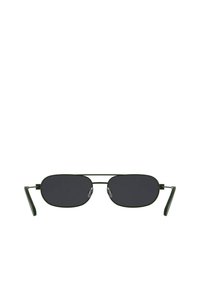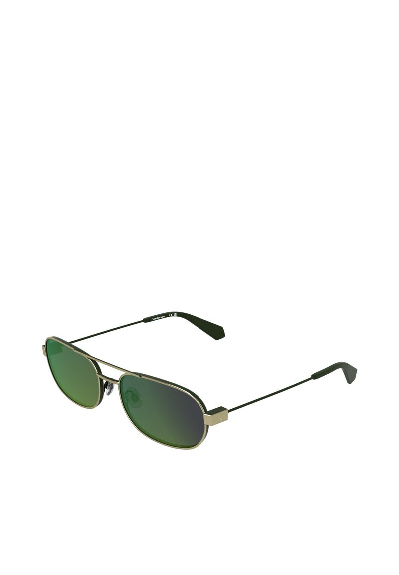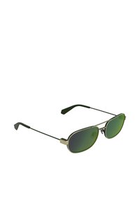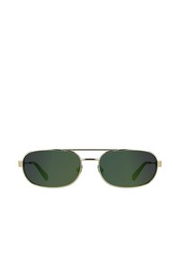 Lunettes de soleil rectangulaires teintées vert avec une fine monture en métal doré et des branches noires, présentées légèrement inclinées sur fond blanc.
