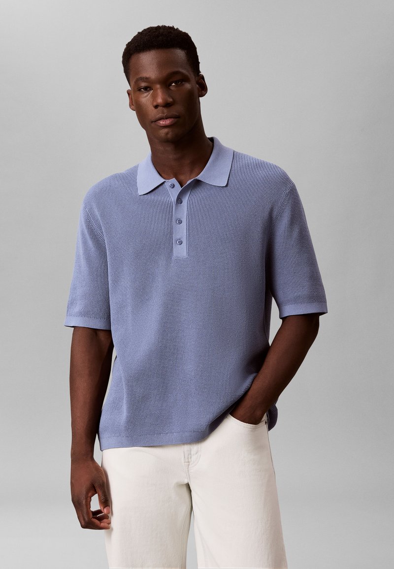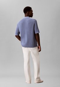 Homme portant un polo bleu clair texturé à manches courtes et un pantalon blanc, debout avec une main dans la poche sur un fond gris uni.