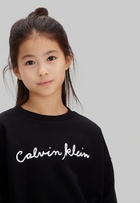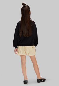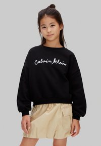 Jeune fille debout portant un sweat-shirt noir Calvin Klein, une jupe beige avec poches, et des chaussures Mary Jane noires sur un fond gris.