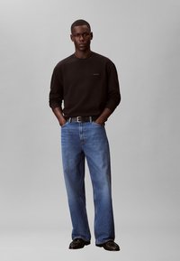 Jeune homme portant un sweat-shirt à manches longues noir Calvin Klein et un jean bleu avec une ceinture noire, debout avec une main dans la poche, sur un fond gris.