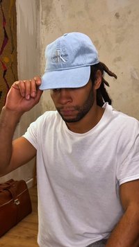 Casquette de baseball en denim bleu clair avec visière courbée et logo brodé "cK" à l'avant, présentée sur un fond clair uni.
