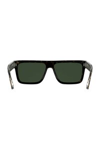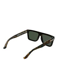Lunettes de soleil rectangulaires noires avec des verres vert foncé et des branches à motif écaille de tortue, ornées d'un détail à double bande argentée près des charnières.