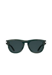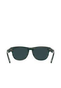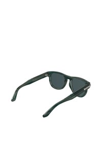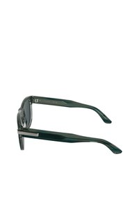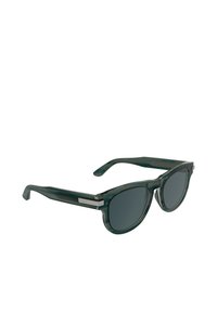 Lunettes de soleil à monture transparente vert foncé avec verres sombres et détails de charnière en argent, inclinées pour montrer la vue de face et de côté.