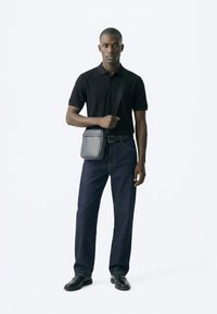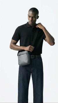 Homme portant un polo noir, un jean foncé, des chaussures noires et un sac bandoulière gris, debout devant un fond blanc.