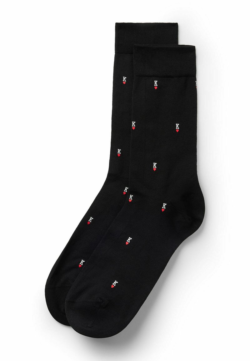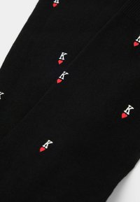 Chaussettes noires pour homme ornées de petits « K » blancs au-dessus de symboles de cœur rouges, répartis de manière uniforme.