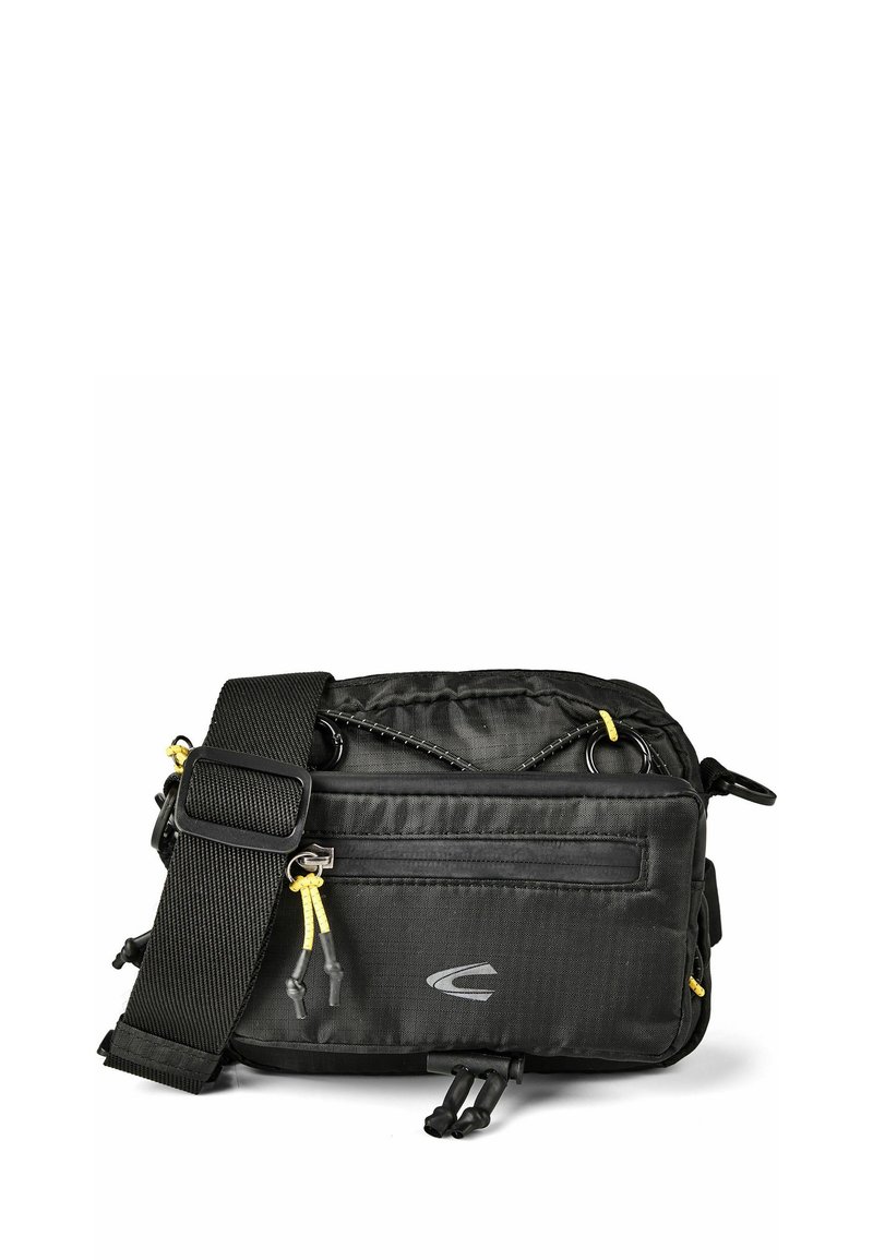 Petit sac bandoulière noir compact avec sangle large réglable, poche zippée à l'avant, détail en corde élastique et tirettes de fermeture éclair jaunes, sur fond blanc.
