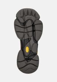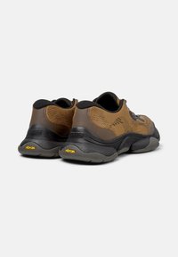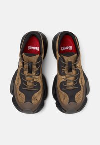 Baskets basses marron et noires avec tissu texturé, semelle noire épaisse segmentée et fermeture à lacets.