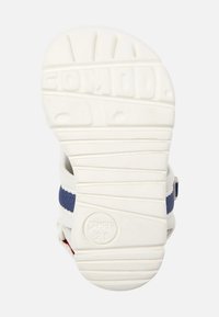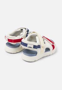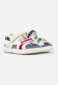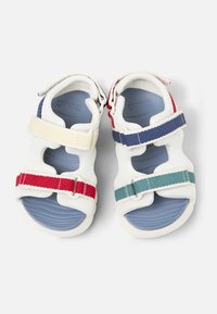 Sandale blanche comportant des brides bleues, rouges et vertes. Conception légère avec une semelle texturée et une semelle intérieure moulée pour le confort.
