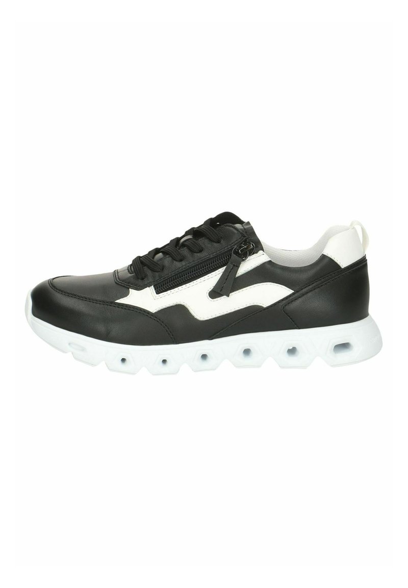 Chaussures de sport noires et blanches avec une tige en cuir lisse, des lacets texturés et une fermeture éclair latérale, dotées d'une semelle extérieure en caoutchouc blanche et épaisse.