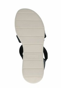Sandales bleu marine avec des brides douces et texturées et une semelle claire contrastante. Elles présentent un talon bas et rembourré ainsi qu'un soutien arrière élastique.