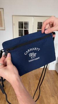Pochette bracelet Carhartt bleu marine avec fermeture éclair et sangle noires, ornée du texte blanc "Carhartt Wip Eightynine" sur le devant.