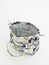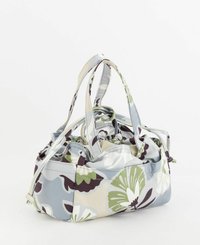 Petit sac à main en tissu avec un motif floral vert, blanc et marron, deux poignées et une fermeture par cordon.
