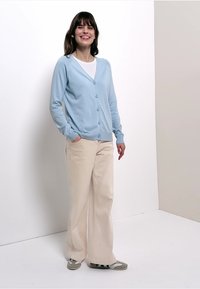 Femme aux longs cheveux bruns portant un cardigan bleu clair boutonné, un t-shirt blanc et un pantalon beige, debout devant un fond blanc.