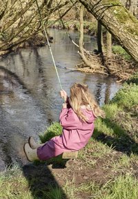 Enfant en combinaison de pluie rose assis sur une balançoire en bois, tenant une corde verte, à côté d'un ruisseau avec de la verdure et des arbres en arrière-plan.
