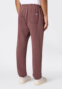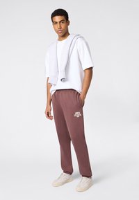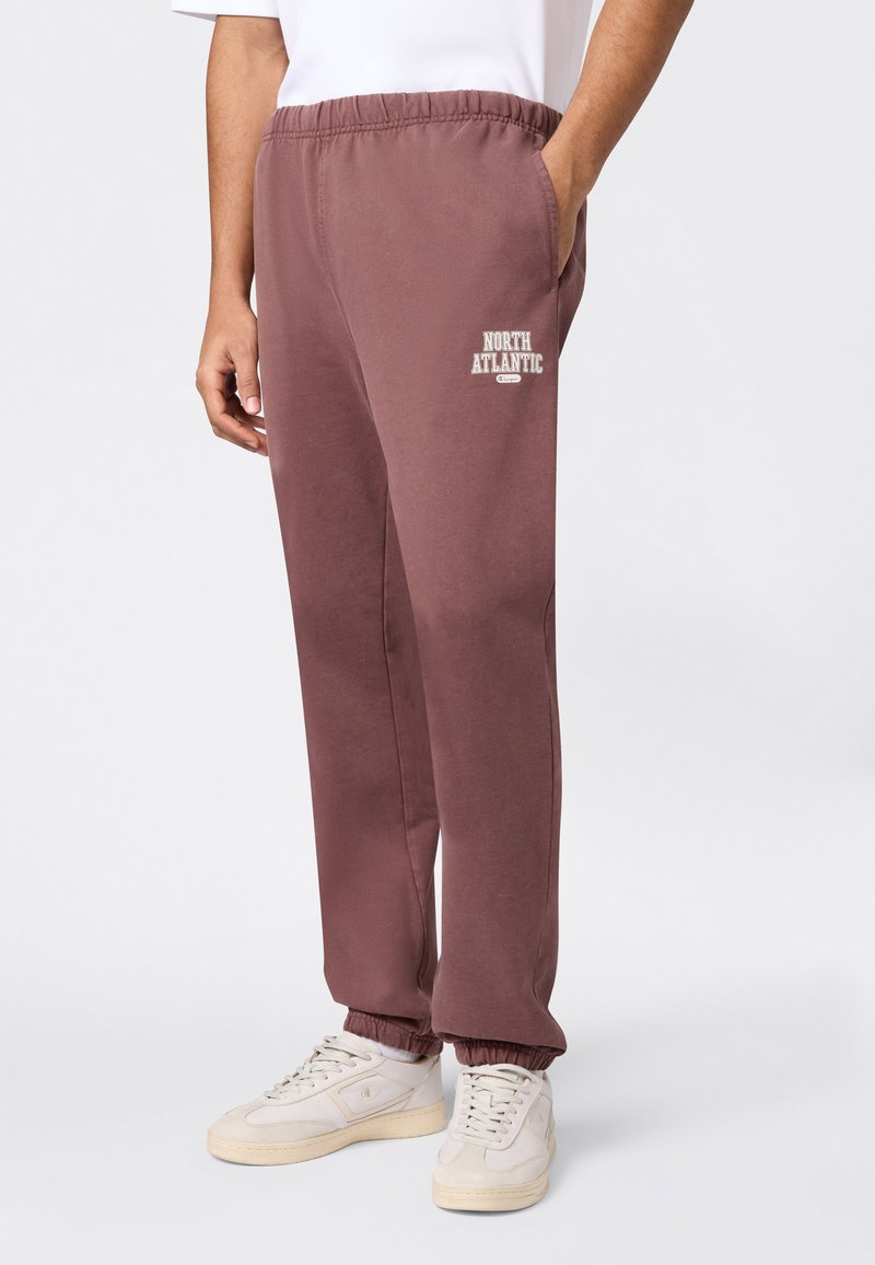 Personne portant un pantalon de survêtement marron à taille élastique avec le texte « North Atlantic » sur la cuisse et des baskets blanches, debout devant un fond uni.