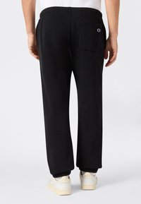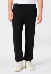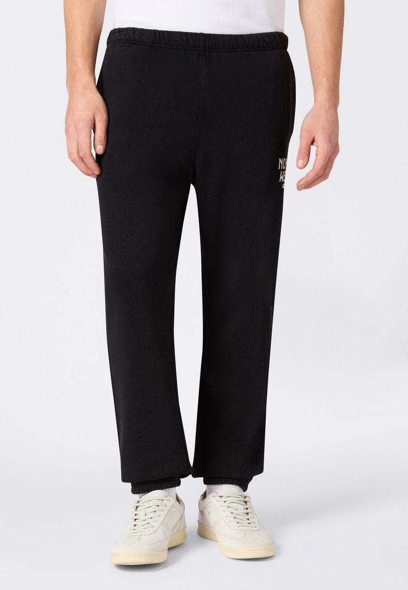 Homme portant un pantalon de jogging noir à taille élastique avec un logo blanc sur la cuisse, associé à des baskets blanches et des chaussettes blanches sur un fond uni.