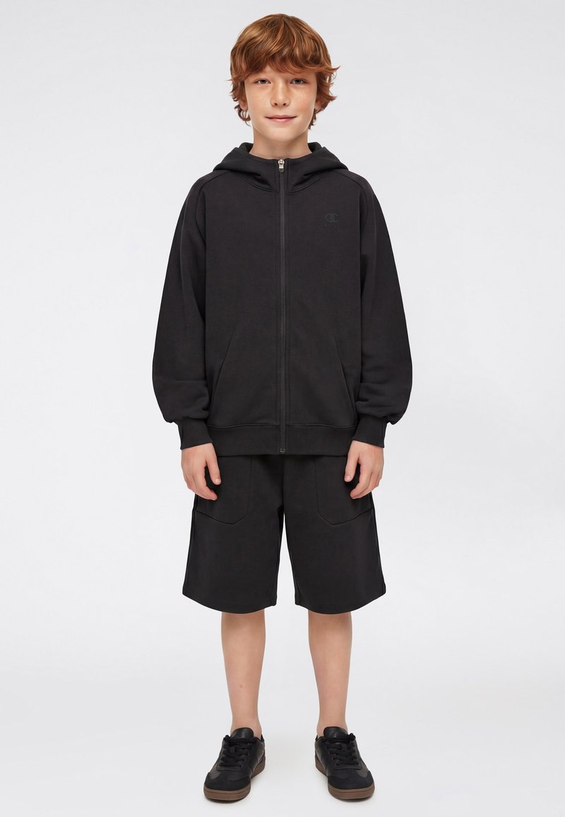 Garçon aux cheveux châtain clair portant un sweat à capuche noir zippé, un short noir jusqu'aux genoux et des baskets noires, debout devant un fond gris uni.
