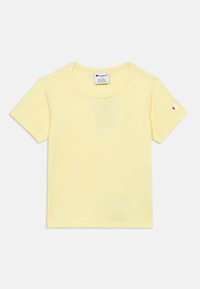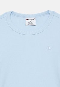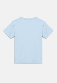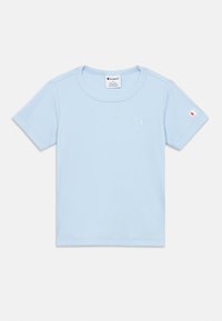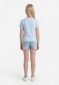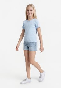 Fille souriante aux longs cheveux blonds porte un t-shirt bleu clair, un short en jean et des baskets blanches, debout sur un fond blanc uni.