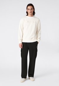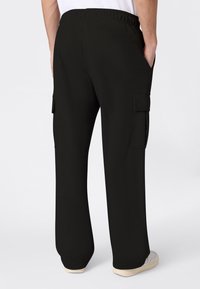 Pantalon cargo noir avec une taille élastique, des poches latérales, et un petit logo. Confectionné dans un tissu doux avec une coupe droite.