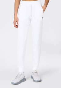 Pantalon de survêtement blanc avec taille et poignets élastiques, doté de poches latérales et d'un petit logo sur la hanche gauche. Conçu avec une texture lisse.