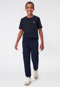 Garçon souriant marchant vers l'avant portant un t-shirt noir Champion, un pantalon cargo foncé et des baskets blanches Champion sur un fond uni.