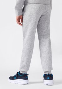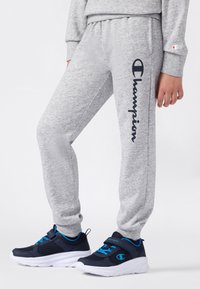 Ensemble sweat-shirt et pantalon de jogging gris avec taille élastique, arborant un logo bleu foncé sur le pantalon. Porté avec des baskets bleu marine.