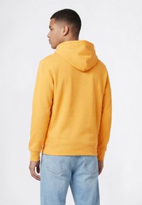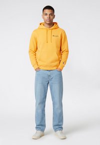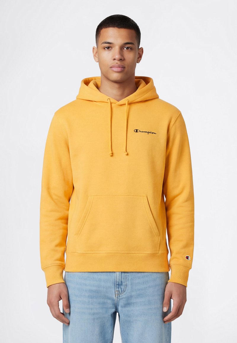 Jeune homme portant un sweat à capuche jaune Champion avec cordons et une poche avant, associé à un jean bleu clair, debout devant un fond blanc.