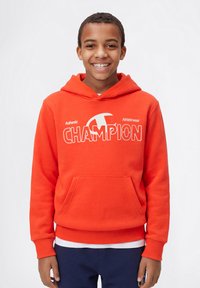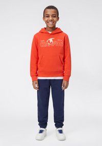 Sweat à capuche orange avec un logo blanc "CHAMPION", poche kangourou, associé à un pantalon de survêtement bleu marine et des baskets blanches avec des lacets bleus.