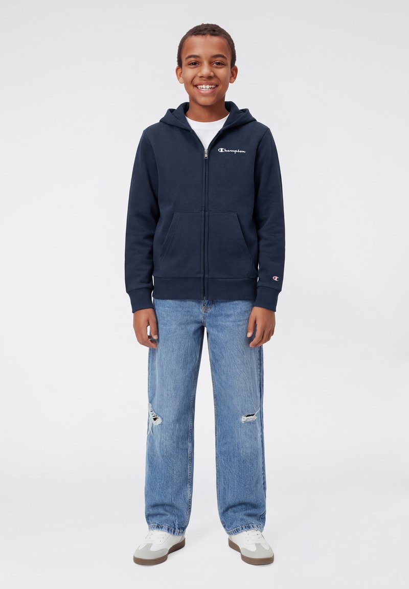 Sweat à capuche zippé bleu marine avec poche avant et logo brodé, associé à un jean bleu clair déchiré et des chaussures blanches avec des accents marron.