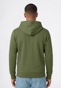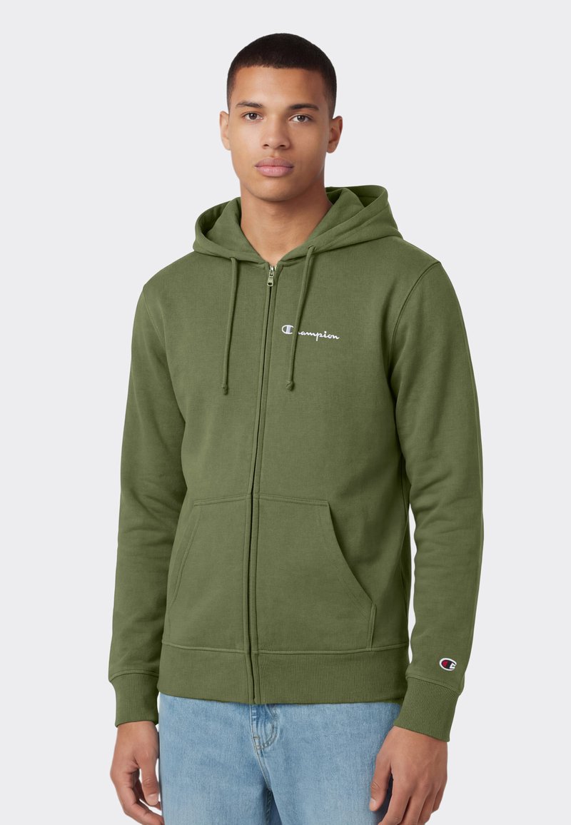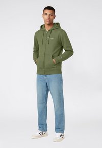 Jeune homme portant un sweat à capuche zippé vert olive avec une capuche et des poches avant, associé à un jean bleu clair, se tenant devant un fond uni.