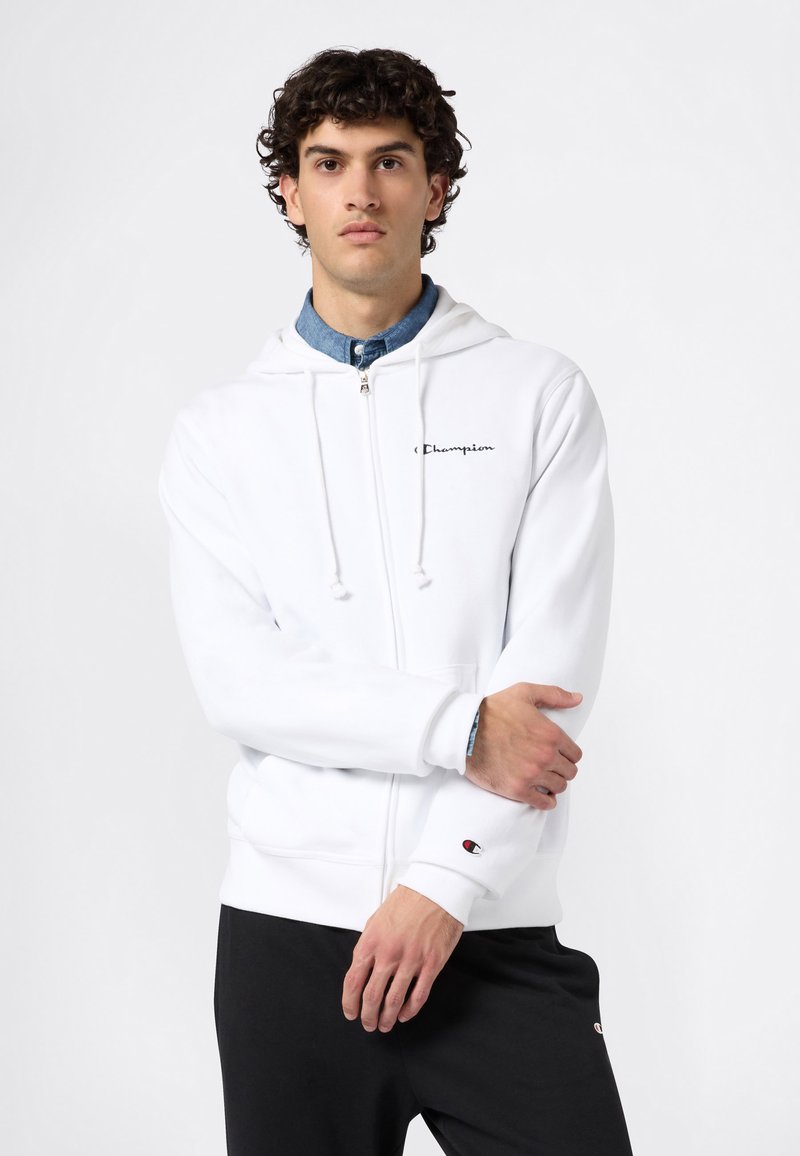 Sweat à capuche blanc zippé en tissu doux, avec un logo noir sur la poitrine et un petit logo sur la manche. Porté par-dessus une chemise en denim.
