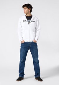 Sweat à capuche à fermeture éclair blanc avec un logo "Champion" noir sur la poitrine, doté d'une poche avant et d'une capuche avec cordon de serrage. Associé à un jean bleu.