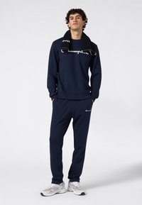 Sweatshirt bleu marine avec logo "Champion" blanc, col rond, manches longues, poignets et ourlet côtelés, fabriqué en tissu doux et texturé.