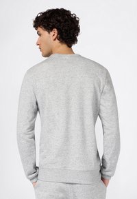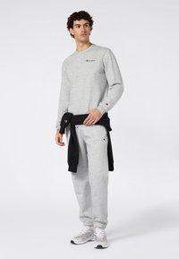 Sweat-shirt en coton gris avec un col rond, des manches longues, et un petit logo "Champion" noir sur la poitrine. Poignets et ourlet élastiques.
