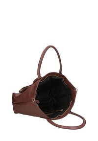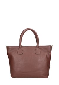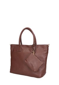 Sac fourre-tout en cuir marron avec une finition texturée, deux poignées et une bandoulière amovible. Comprend une petite pochette assortie.