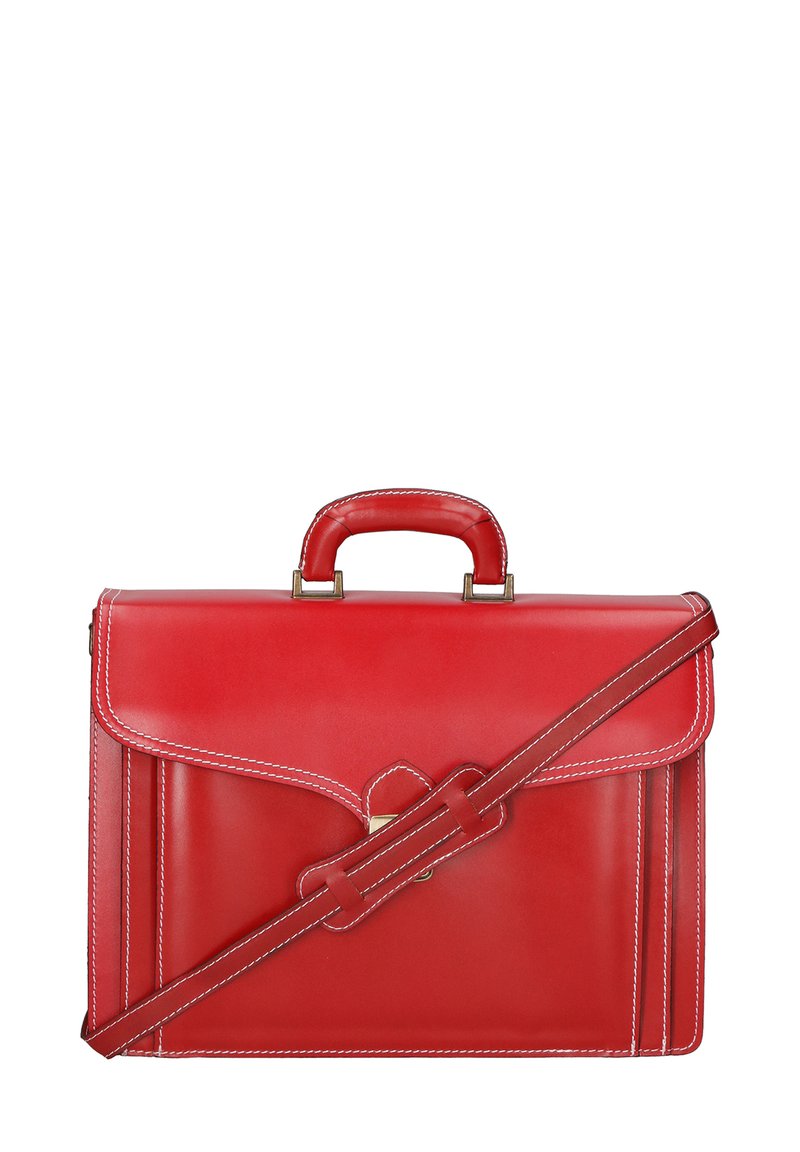 Malette en cuir rouge avec une forme structurée, couture blanche contrastante, poignée supérieure et une bandoulière réglable. Elle dispose d'une fermeture à fermoir.