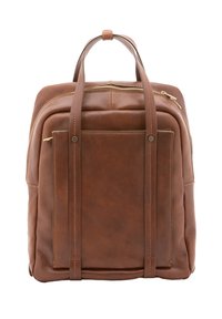 Femme portant une chemise à rayures bleues et un jean, portant un sac à dos en cuir marron avec deux poignées et des compartiments zippés.
