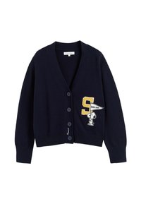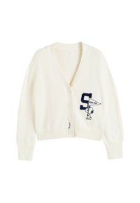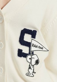Cardigan couleur crème avec poignets et ourlet côtelés. Dispose d'un col en V profond, de cinq boutons et d'un motif Snoopy avec le texte "RAH RAH".