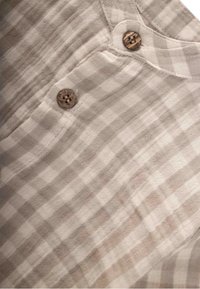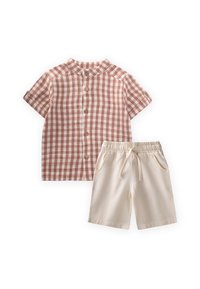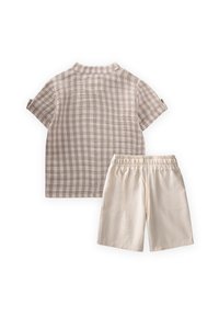 Chemise beige à manches courtes à carreaux avec boutons et short crème à cordon, disposés à plat sur un fond blanc.