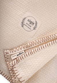 Carré de tissu beige texturé avec une bordure marron cousue et une étiquette centrale portant l'inscription « cigit BOHEME qualité premium » avec une décoration de feuilles.
