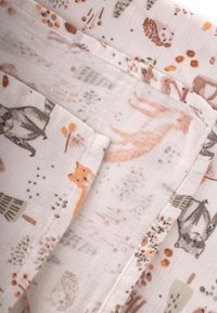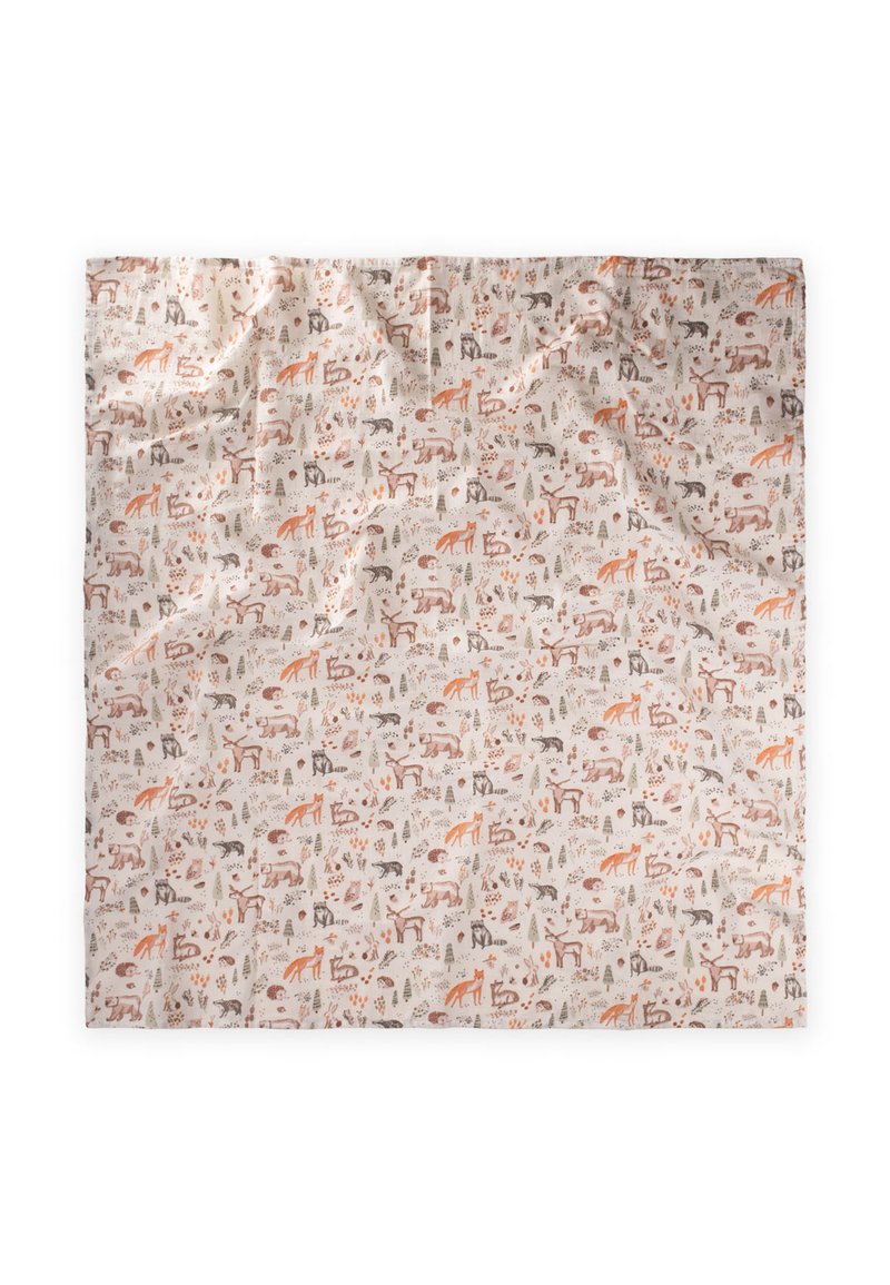 Carré de tissu avec un fond beige clair présentant de petites illustrations répétées d'animaux de la forêt tels que des ours, des renards, des cerfs et des hérissons en tons marron et orange.