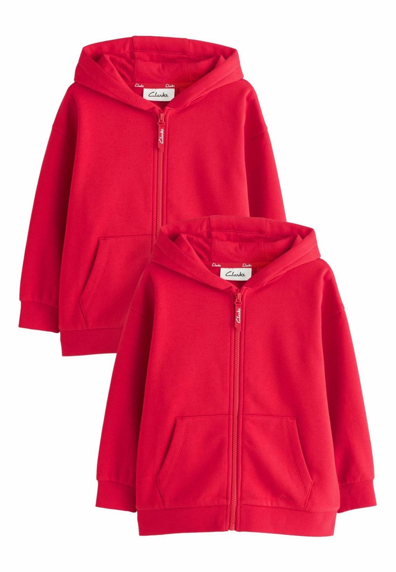 Deux sweats à capuche rouges zippés avec poches avant, poignets côtelés et marquage Clarks sur la fermeture éclair et l'étiquette du col.