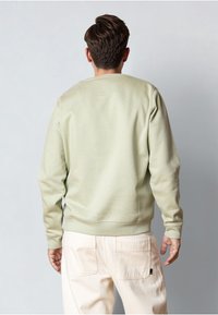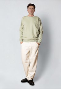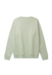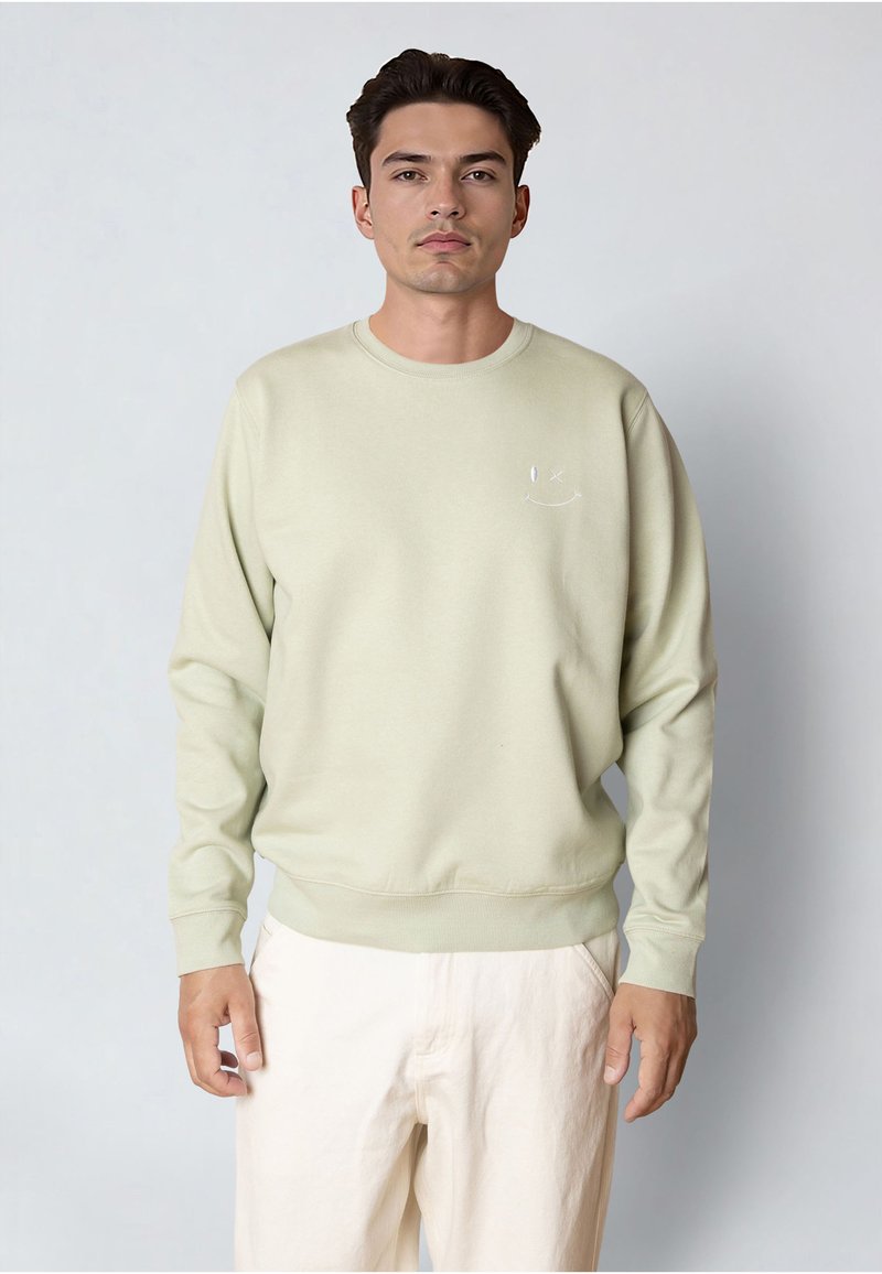 Sweat-shirt vert clair en coton biologique, col rond, poignets et ourlet côtelés, avec une petite broderie blanche de smiley sur la poitrine.